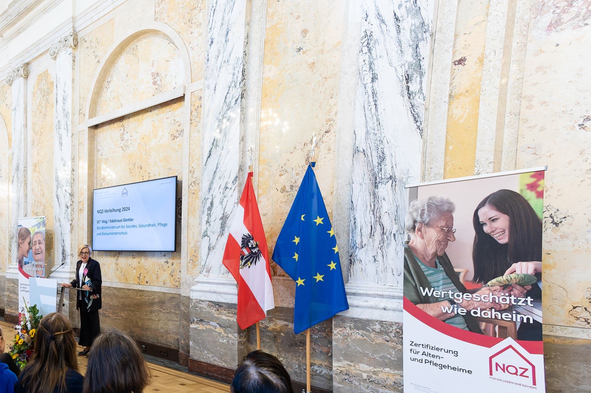 Im Rahmen einer feierlichen Zeremonie wurde die Auszeichnung von Mag.a Edeltraud Glettler, Sektionsleiterin im Bundesministerium für Soziales, Gesundheit, Pflege und Konsumentenschutz, überreicht. Das NQZ bestätigt nicht nur die Einhaltung strenger Qualitätskriterien, sondern würdigt auch das Engagement des gesamten Teams. Mitarbeitende, die mit großer Mühe und vollem Engagement täglich dafür sorgen, dass die Bewohner:innen ihren Lebensabend in bester Qualität verbringen können, sollen mit der Auszeichnung hervorgehoben und belohnt werden. Nach dem Motto „Wertgeschätzt wie daheim“ möchte das NQZ älteren Menschen die Möglichkeit geben, an einem Ort zu wohnen, an dem sie sich wie zuhause fühlen. Auch für Hausleiter Robert Feiertag und sein Team hat das Wohlempfinden der Bewohner:innen Priorität: „Es ist eine wunderbare Anerkennung für die harte Arbeit, die unser Team jeden Tag leistet. Unsere oberste Priorität ist es, dass sich die Senior:innen bei uns wie zuhause fühlen und in einer Atmosphäre der Geborgenheit und des Vertrauens leben können.“